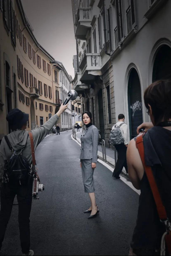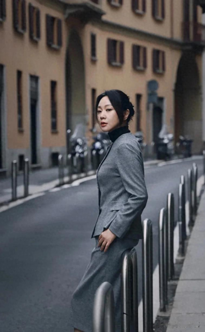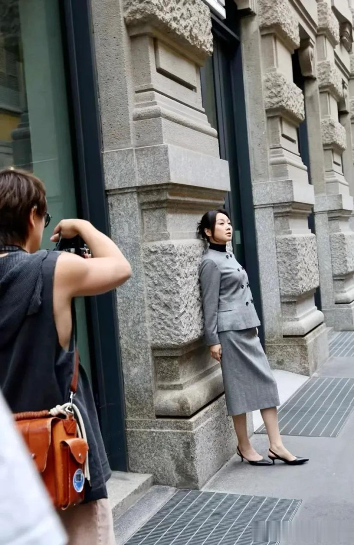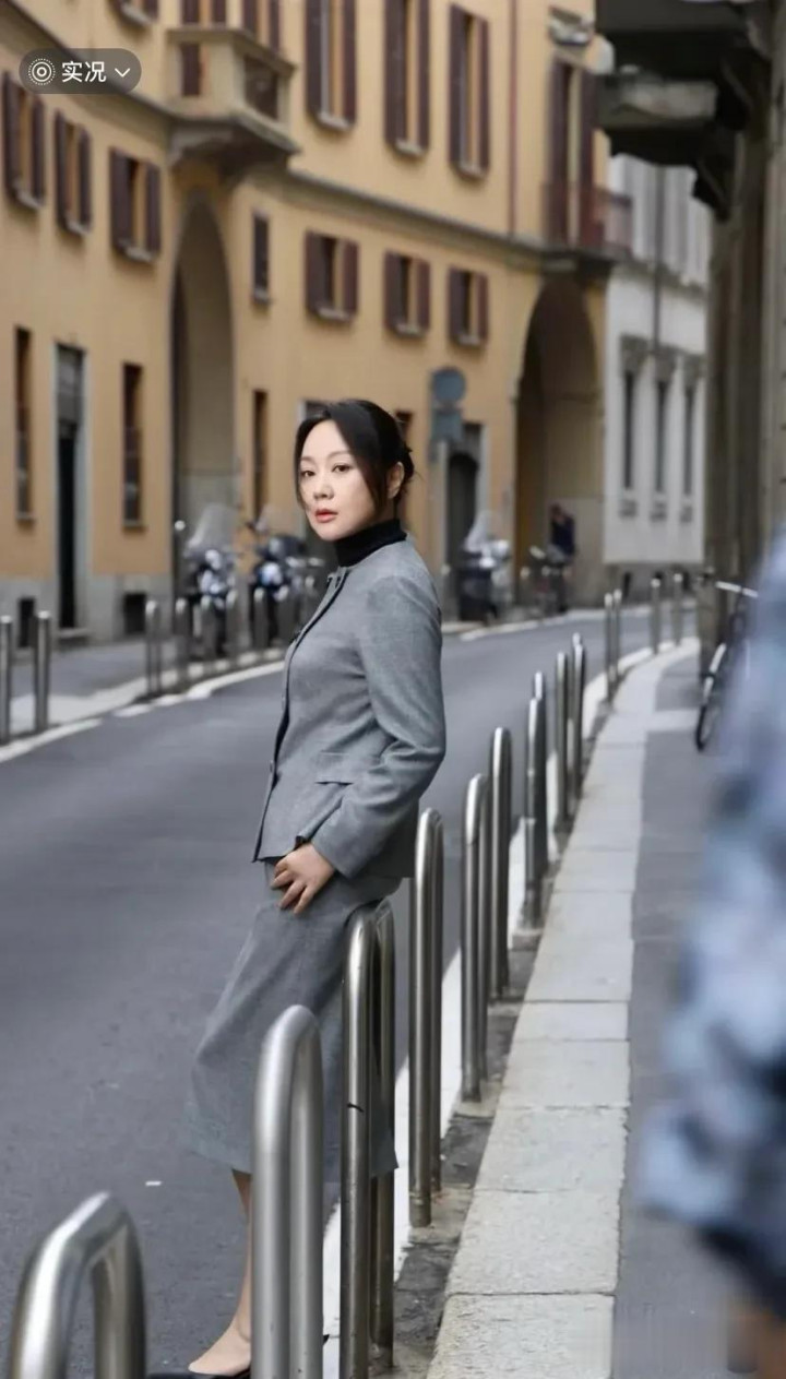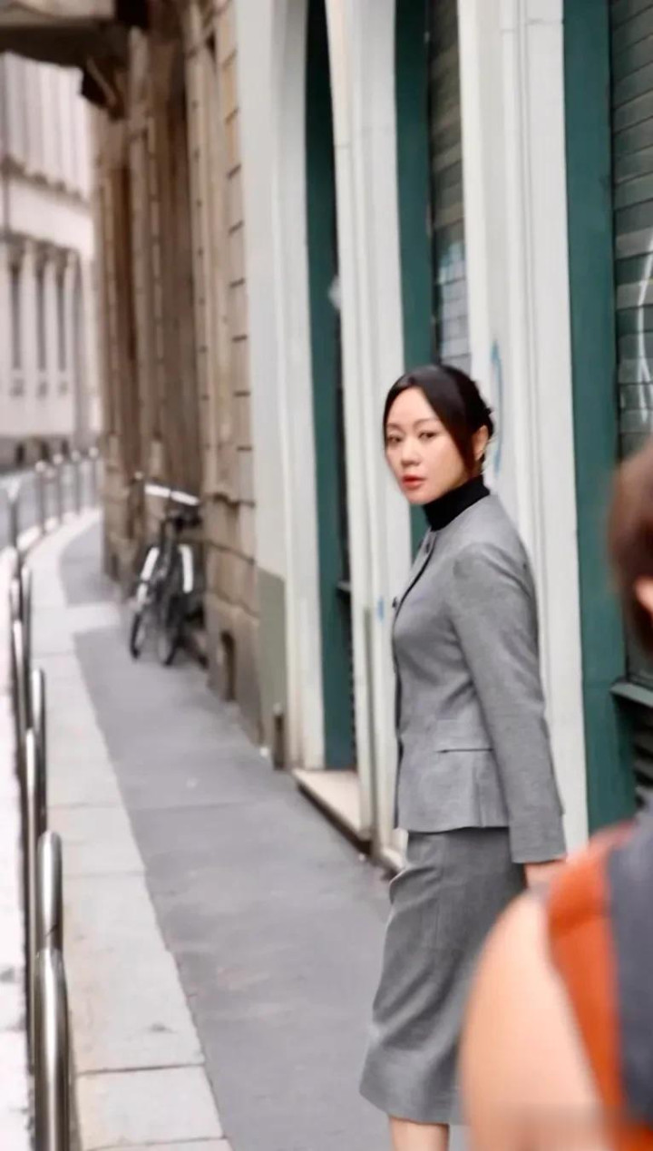 闫妮米兰时装周花絮图, 一身剪裁利落的灰色西装套裙, 优雅干练!
