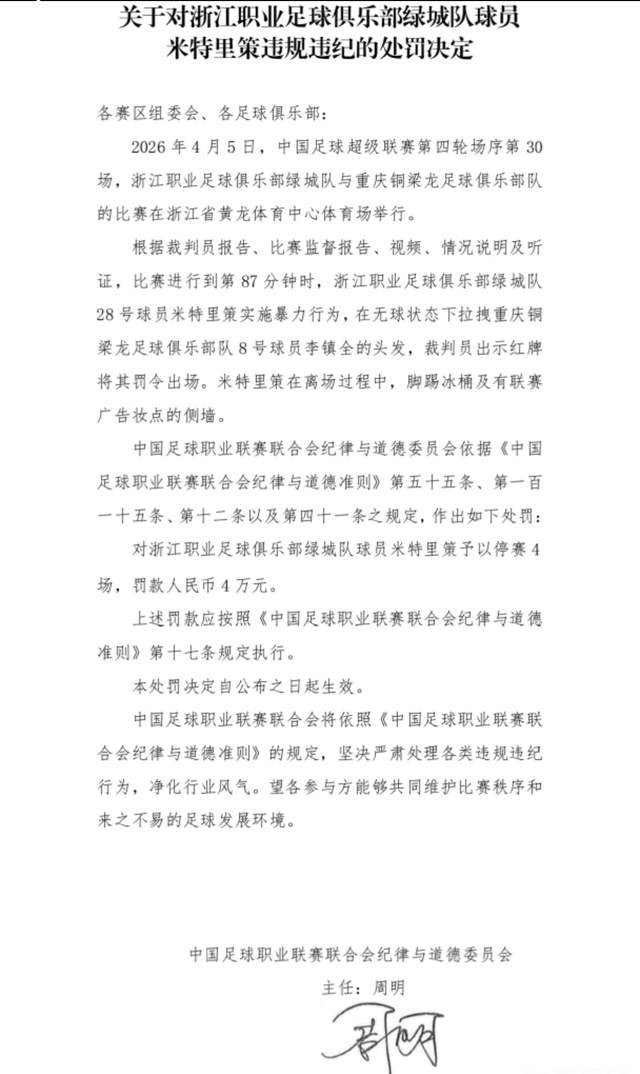 重庆铜梁龙看来真的要载入史册了。中超上轮的最大冲突和争议,李镇全和米特里策的事件还在发酵。足协不仅对米特里策进行4场追加处罚,而且对重庆铜梁龙助理教练杜宇辱骂裁判开出了停赛6场的重磅罚单,之前也传出李镇全赛场骂人的行为同样会被追加2场处罚。