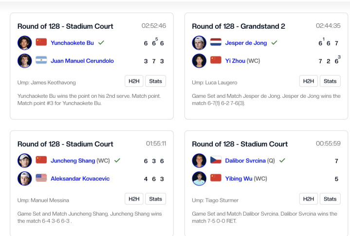 吴易昺在首盘盘末阶段不慎拉伤大腿肌肉,在5比7丢掉首盘后因伤退赛,他的对手斯夫尔奇纳晋级第二轮。