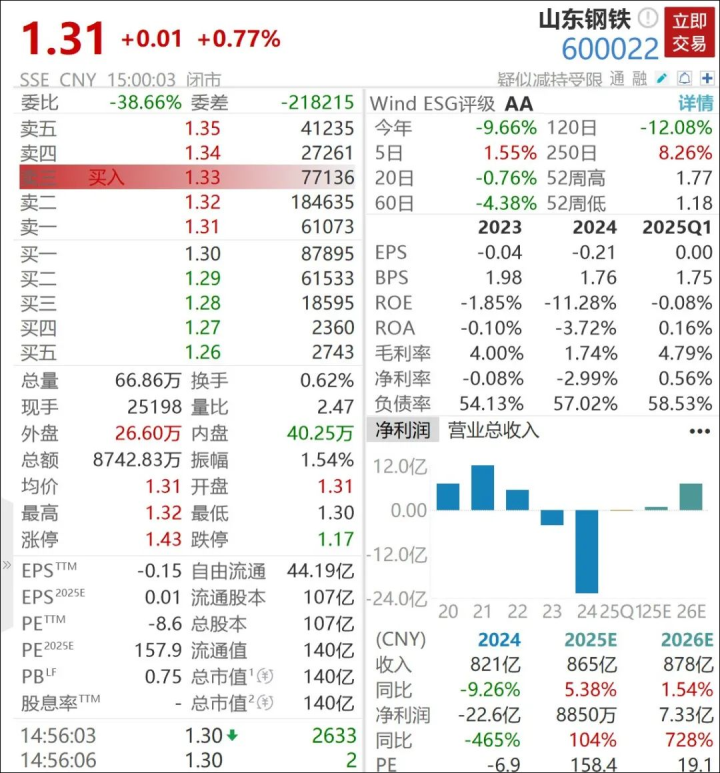 截至27日收盘,山东钢铁股价报1.31元,总市值140亿元。
