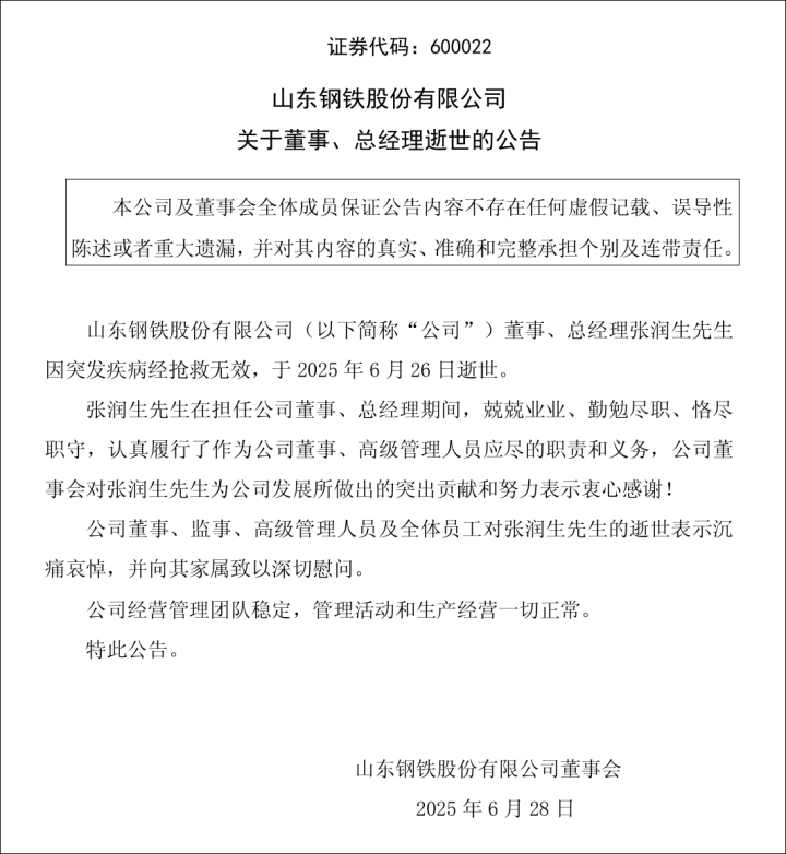 山东钢铁股份有限公司董事会6月28日发布公告:山东钢铁股份有限公司董事、总经理张润生先生因突发疾病经抢救无效,于2025年6月26日逝世。