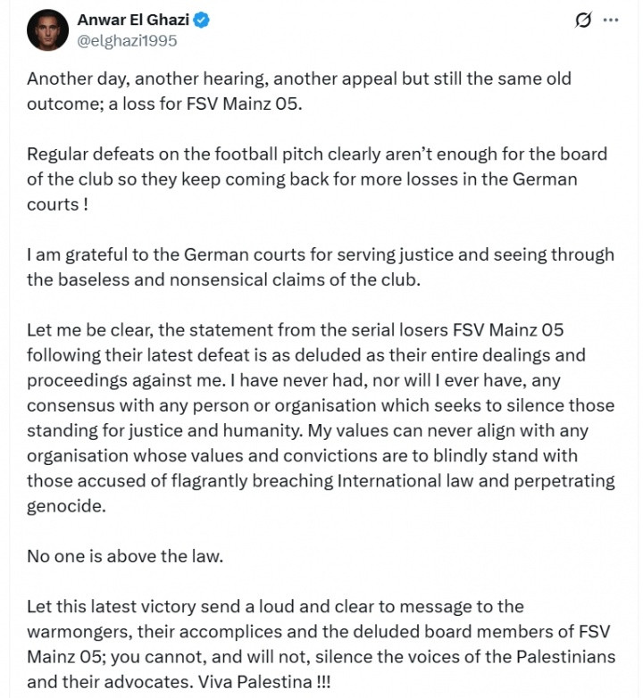 直播吧11月13日讯因支持巴勒斯坦而遭美因茨不当解约的埃尔加齐今日发布社媒,宣告自己对美因茨的官司再度胜诉。