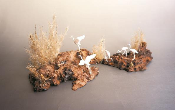 这些温暖的记忆,催生了我创作《东滩见白鹭》的灵感。我挑选随形麻梨木作底板,木材纹理镌刻着岁月奥秘;再购入3D打印的白鹭模型,形态逼真;最后采摘蝴蝶湾的芦花与干草作配饰,为作品注入沧桑韵味。