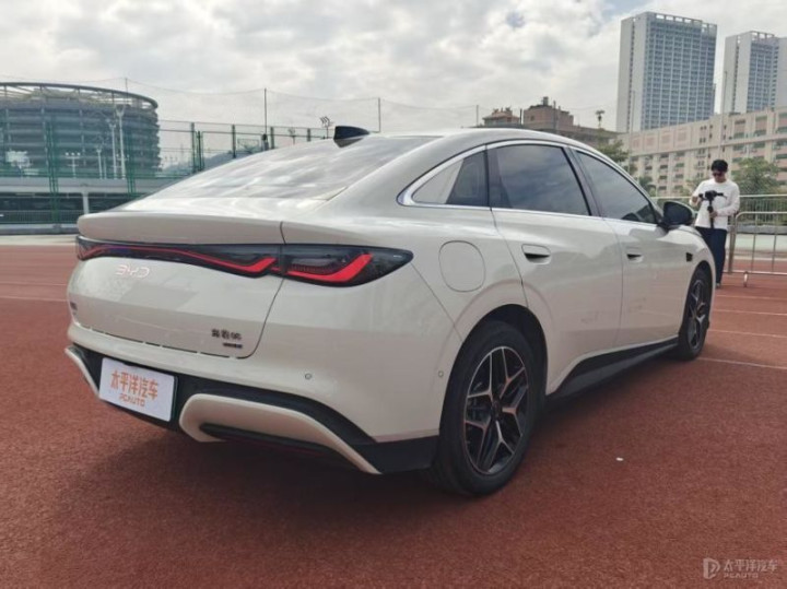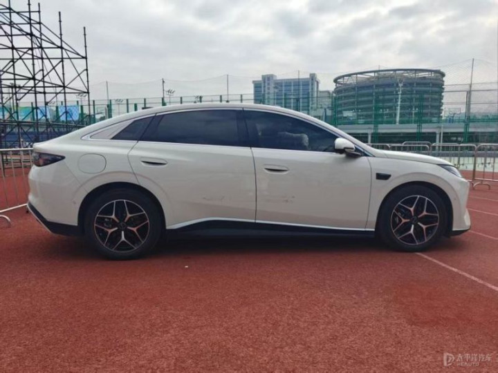 车身侧面,海豹06EV侧面简洁大气,向前贯穿的腰线、裙边线、窗线,勾勒出强烈的向下俯冲姿态,强化了整车的年轻动感氛围。倾斜向前的黑色裙板配合双轮眉设计,让车轮区域的轮廓更有力量感。